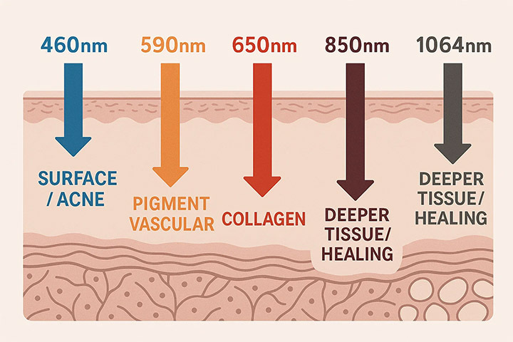 Chaque longueur d'onde a une action précise. Le 660nm contribue à l'éclat en surface, tandis que le 830nm agit en profondeur pour revitaliser et énergiser les couches plus profondes de la peau.